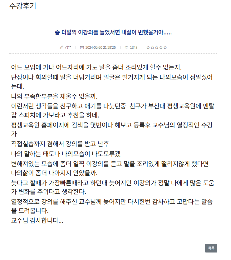 이런저런 생각들을 친구하고 애기를 나눗던중 친구가 부산대 평생교육원에 멘탈갑 스피치에 가보라고 추천을 하네.