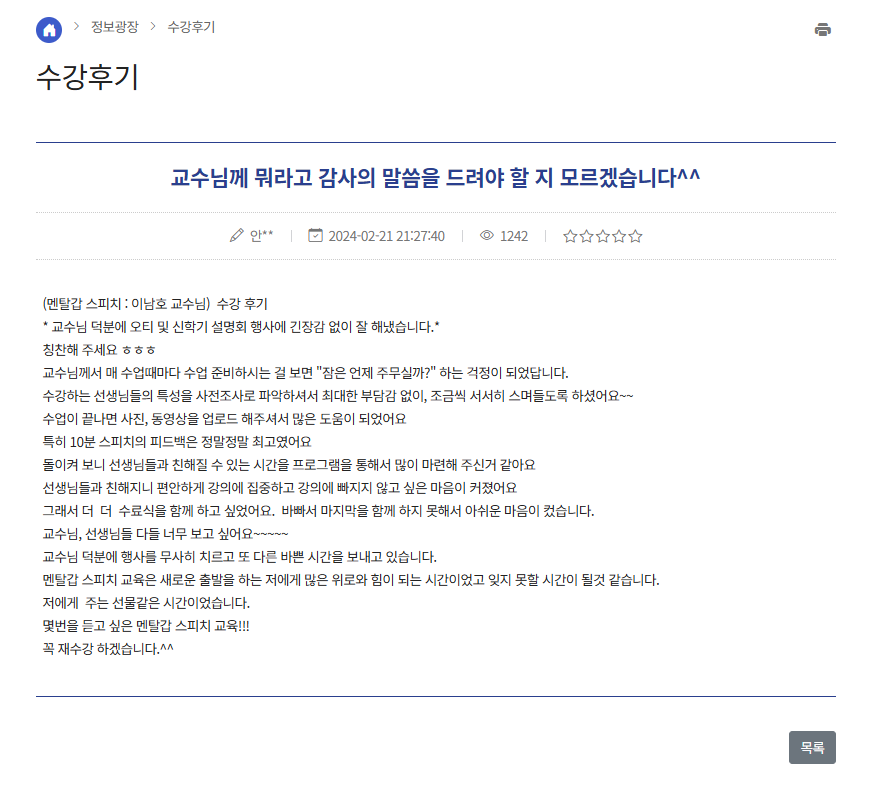 교수님께 뭐라고 감사의 말씀을 드려야 할 지 모르겠습니다^^(멘탈갑스피치 8기)