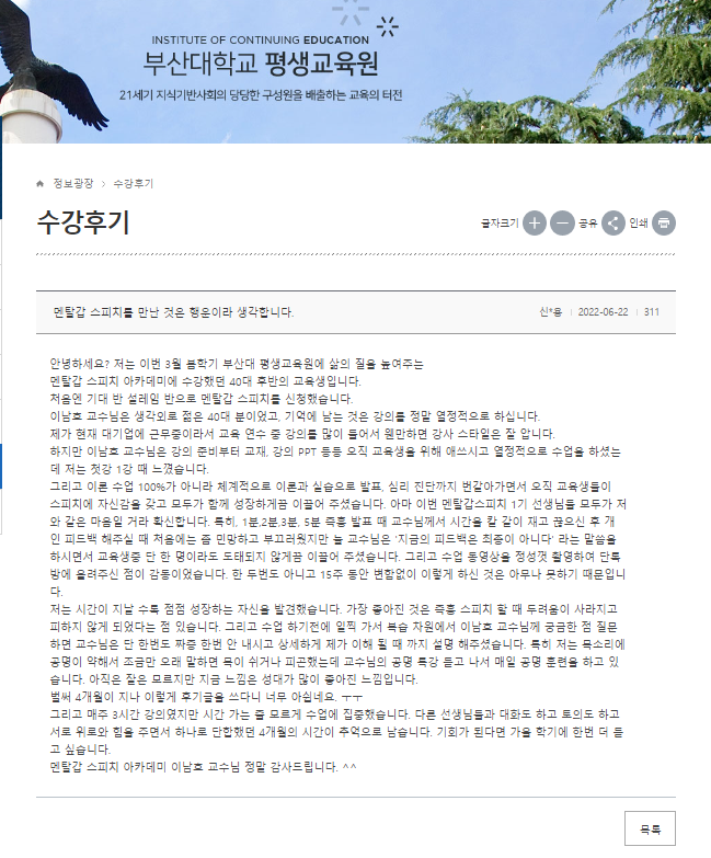 멘탈갑 스피치를 만난 것은 행운이라 생각합니다.(부산대 신*용)